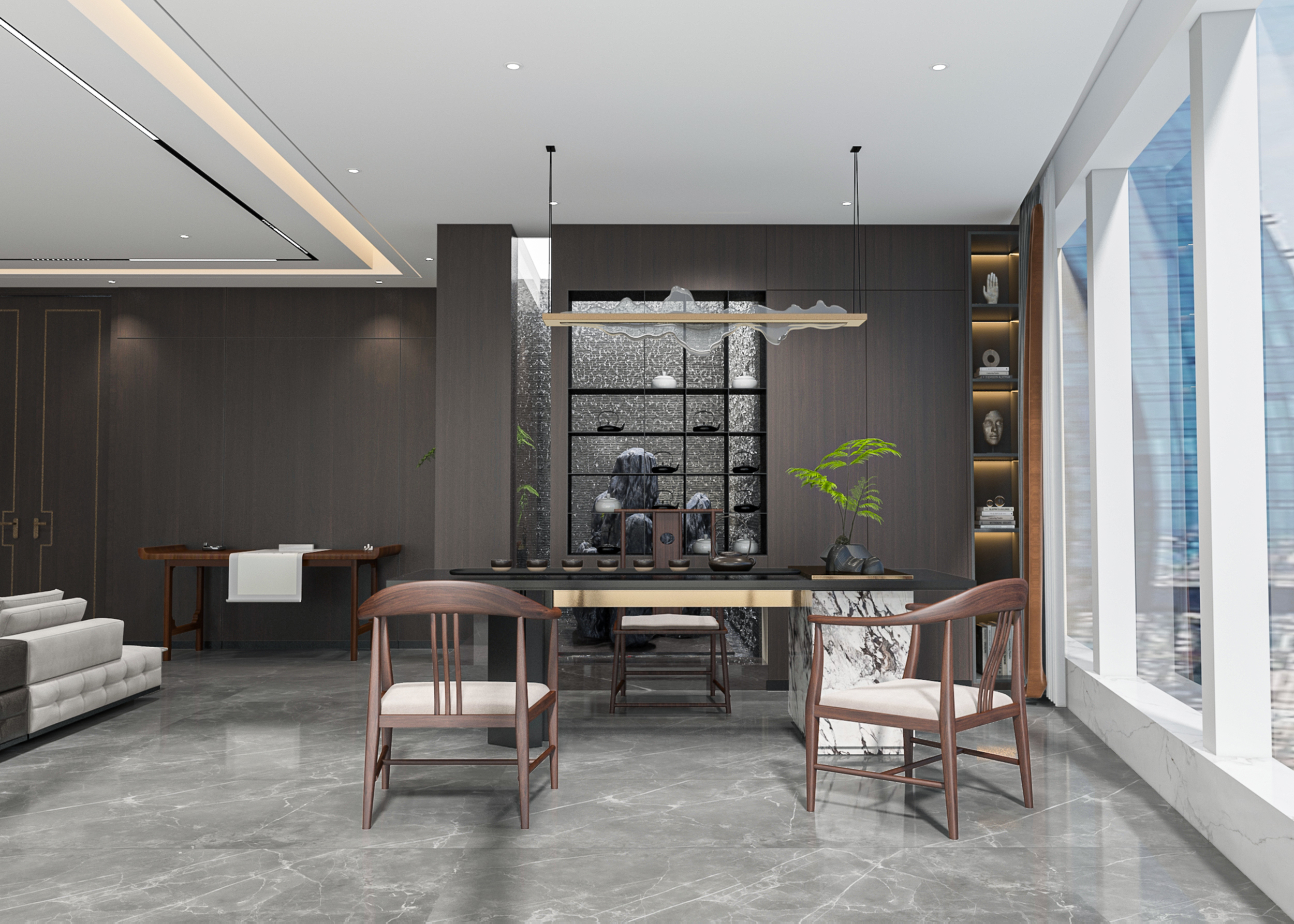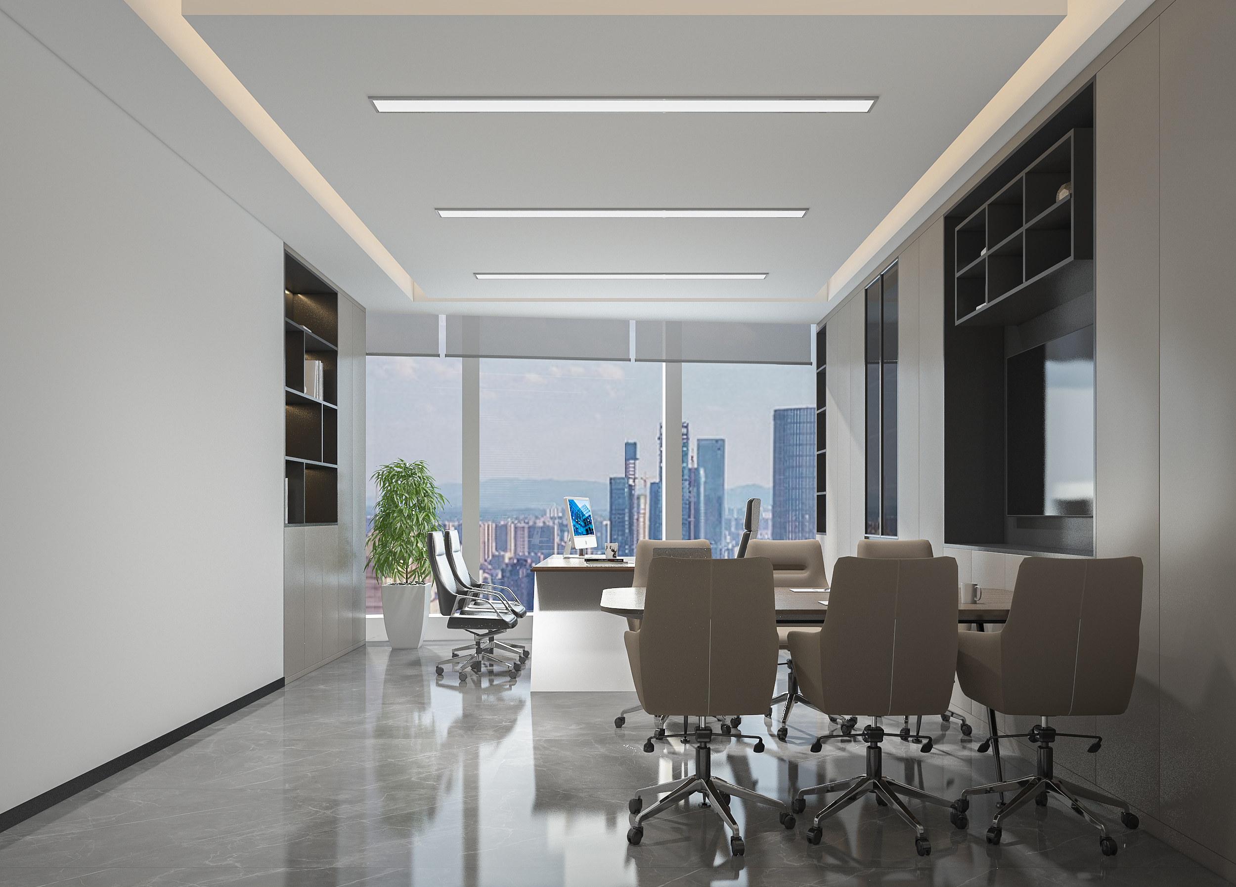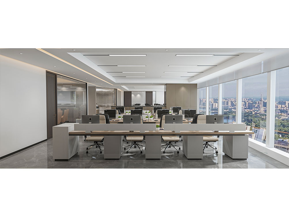 風(fēng)順集團(tuán)裝修效果以 “大氣沉穩(wěn) + 現(xiàn)代高效” 為核心,整體采用深灰、米白為主色調(diào)搭配金屬線條點(diǎn)綴,凸顯企業(yè)質(zhì)感。前臺(tái)接待區(qū)用大理石背景墻嵌入集團(tuán) LOGO,搭配簡(jiǎn)約大氣的接待臺(tái)與藝術(shù)擺件,營(yíng)造專(zhuān)業(yè)第一印象;濟(jì)南辦公室裝修為開(kāi)放辦公區(qū)采用模塊化工位設(shè)計(jì),配備獨(dú)立收納與人體工學(xué)座椅,墻面穿插集團(tuán)發(fā)展歷程掛畫(huà)與綠植,兼顧高效與舒適;會(huì)議室按規(guī)模配置高清會(huì)議系統(tǒng)與吸音材質(zhì),滿足不同商務(wù)需求;同時(shí)預(yù)留休閑茶水區(qū)與榮譽(yù)展示墻,既方便員工放松,也直觀傳遞企業(yè)實(shí)力,整體空間兼具品牌形象與實(shí)用功能。